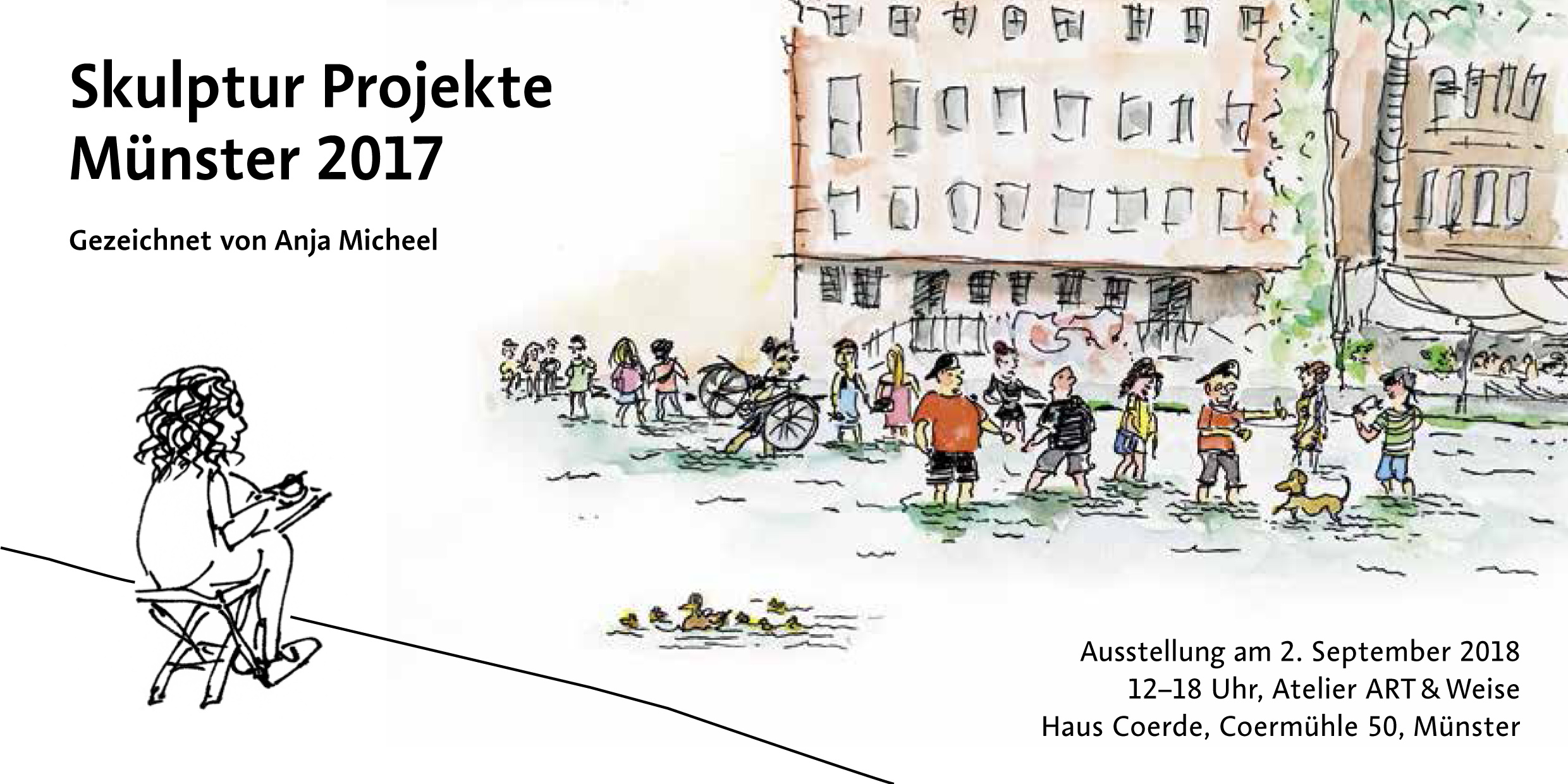 Die 40 Zeichnungen entstanden während der Skulptur Projekte 2017 in Münster und zeigen Beobachtungen von Kunstinteressierten aus aller Welt, die sich, mal staunend, mal ratlos, mal freudig mit den Kunstwerken auseinandersetzen.